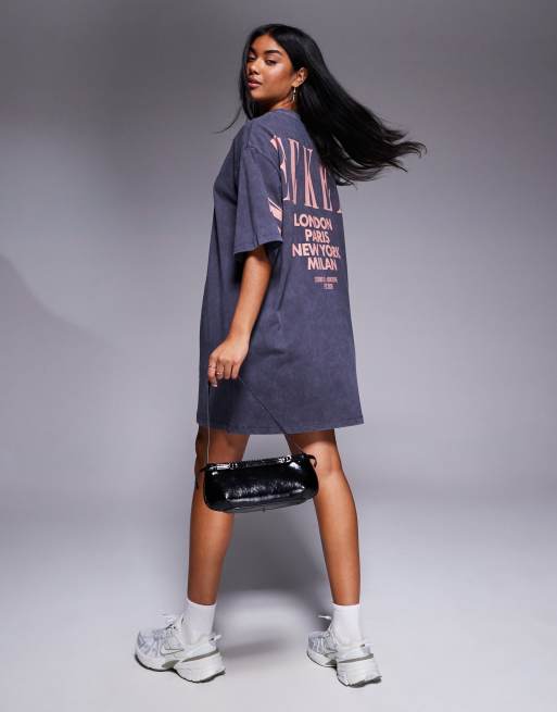 Vestido gris carbón lavado de estilo camiseta con logo apilado en la espalda color melocotón de Weekend Collective