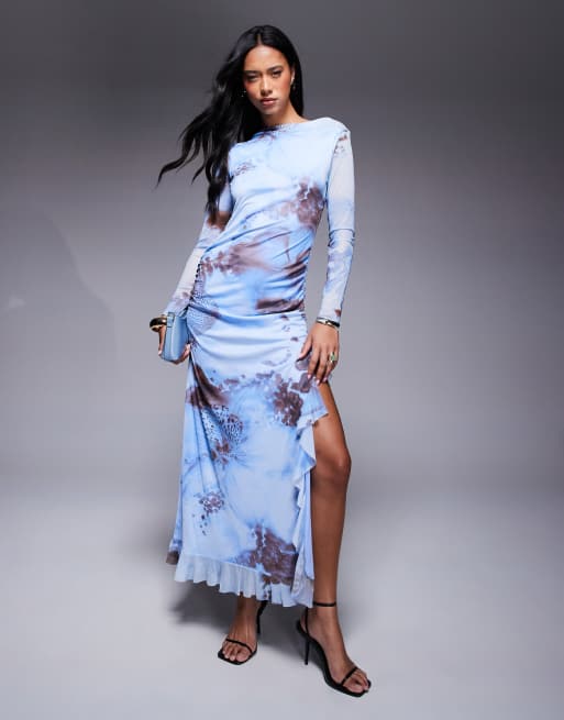 Vestido largo azul de manga larga y corte acampanado con estampado floral y detalle de volante de malla de ASOS DESIGN