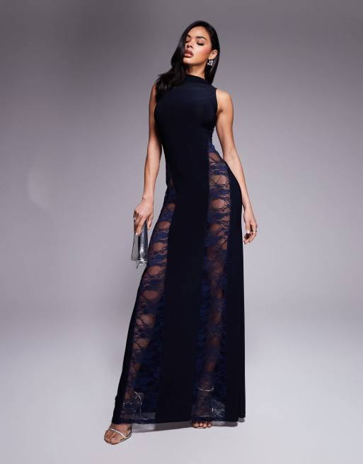 Vestido largo azul marino sin mangas con cuello alto y diseño de paneles de encaje de ASOS DESIGN