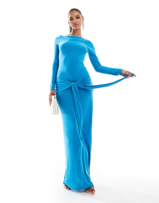 Vestido largo azul muy drapeado con lazada delantera de ASOS DESIGN