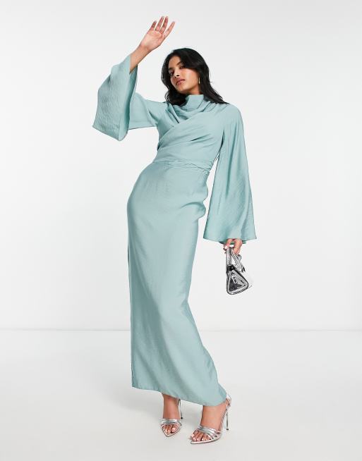 Vestido largo azul negruzco de cuello alto con cintura cruzada y mangas acampanadas de ASOS DESIGN