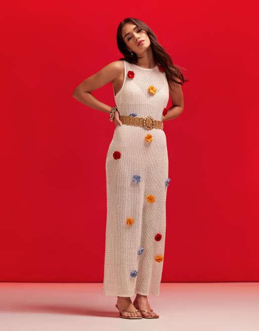 Vestido largo blanco con flores tridimensionales de croché de ASOS DESIGN