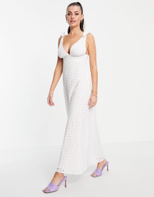 Vestido largo blanco escotado con diseño bordado y tirantes anudados de ASOS DESIGN