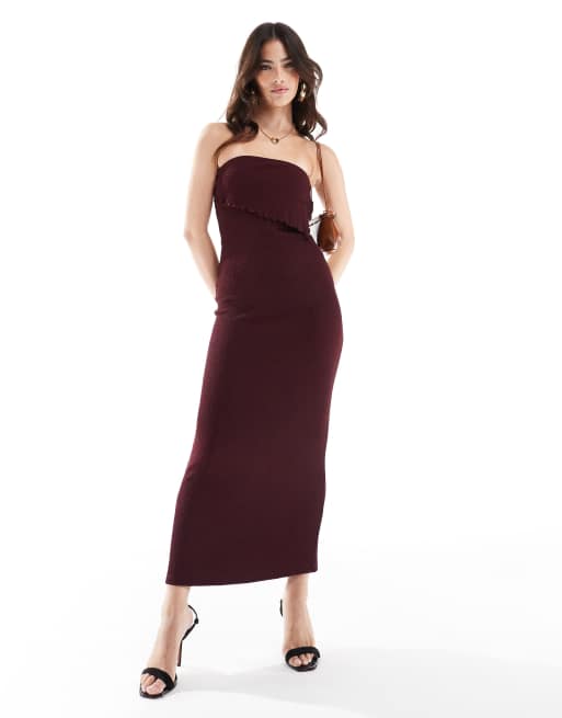 Vestido largo burdeos con escote palabra de honor y detalle plegado de tejido texturizado de ASOS DESIGN