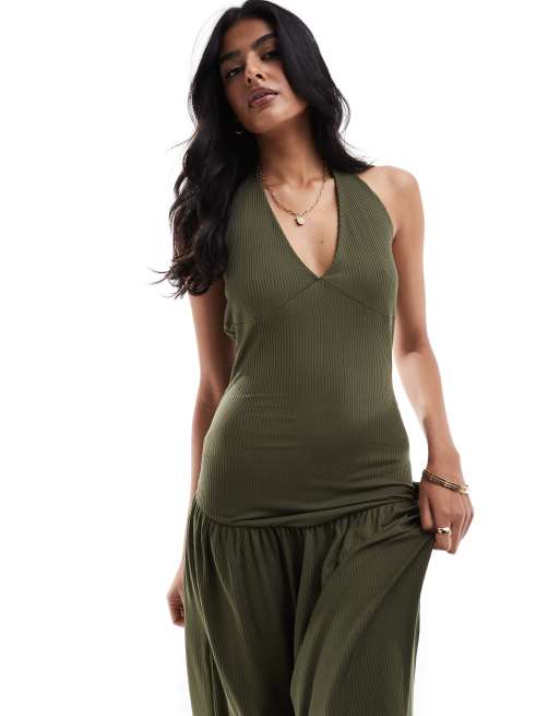 Vestido largo caqui con cintura baja, cuello halter y detalle de costuras en el pecho de canalé de ASOS DESIGN