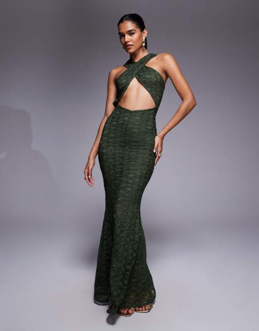 Vestido largo caqui con cuello halter cruzado en la parte delantera y abertura en el cuerpo de encaje de ASOS DESIGN
