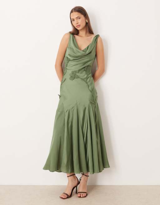 Vestido largo caqui de satén con cuello desbocado, godets y flores tridimensionales de organza de ASOS DESIGN
