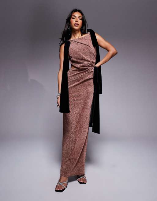 Vestido largo color bronce brillante con escote cuadrado y lazadas extragrandes de terciopelo de ASOS DESIGN
