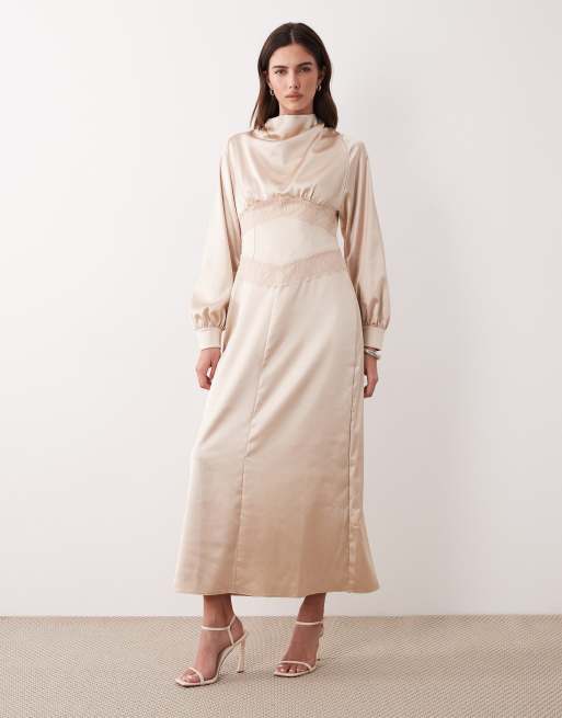 Vestido largo color champán con cuello alto y detalle de encaje de satén de ASOS DESIGN