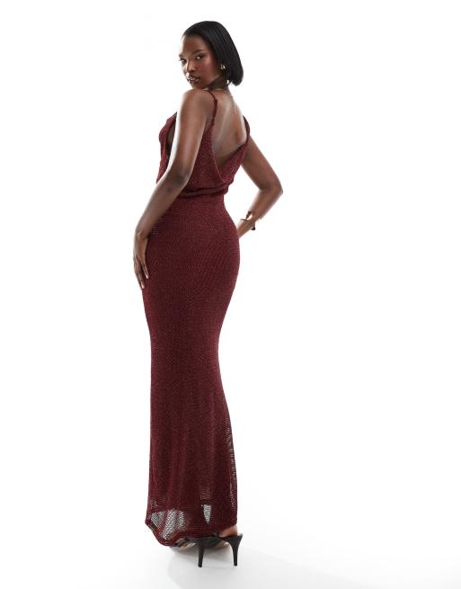 Vestido largo color vino con cuello desbocado y acabado brillante de punto de ASOS DESIGN