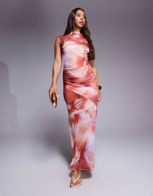 Vestido largo con estampado abstracto, espalda descubierta y mangas de casquillo de malla de ASOS DESIGN