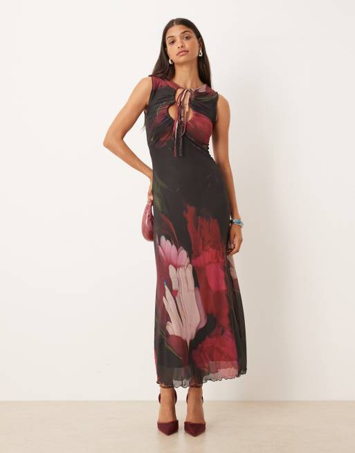 Vestido largo con estampado floral grande, borde ondulado y abertura vertical de malla de ASOS DESIGN