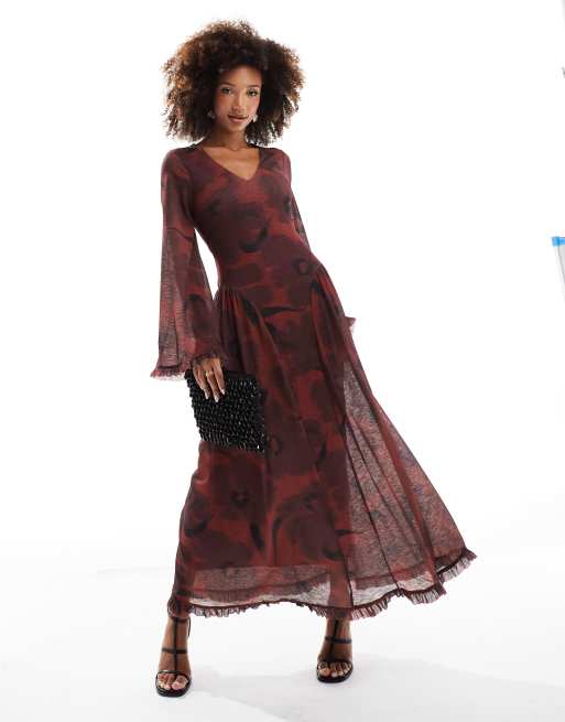 Vestido largo con estampado floral, volantes en las mangas y falda de corte amplio de malla de ASOS DESIGN