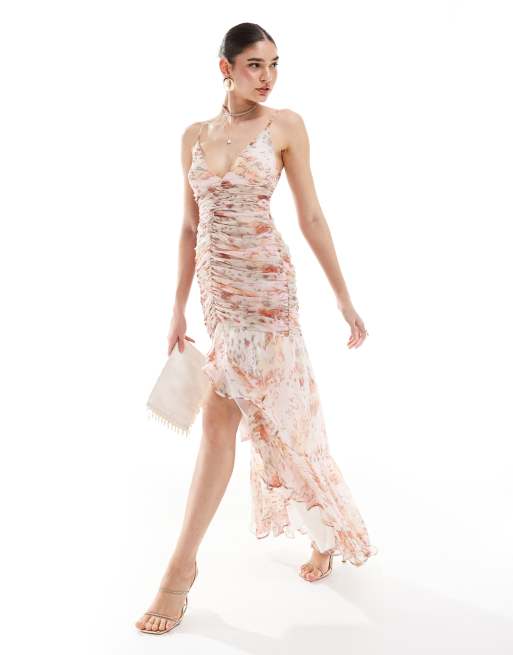 Vestido largo con estampado floral y animal, bajo asimétrico y parte delantera fruncida de ASOS DESIGN