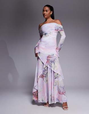 Vestido largo de manga larga con estampado floral, escote Bardot y bajo de volantes de chifón elástico de ASOS DESIGN