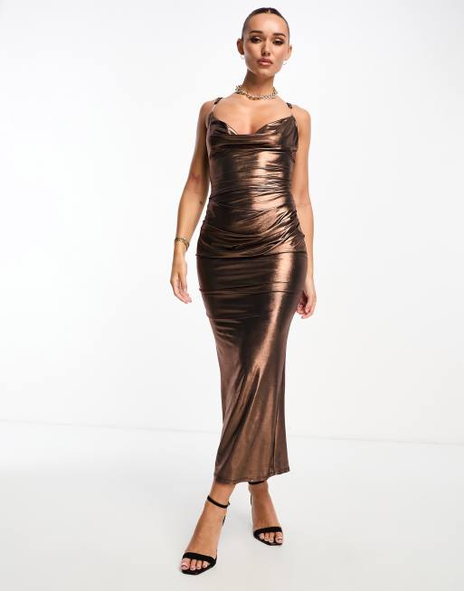Vestido largo dorado metalizado de tirantes finos con escote de ASOS DESIGN