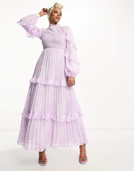 Vestido largo fruncido y plisado con estampado de cachemir, cuello alto y bordes de volantes de ASOS DESIGN