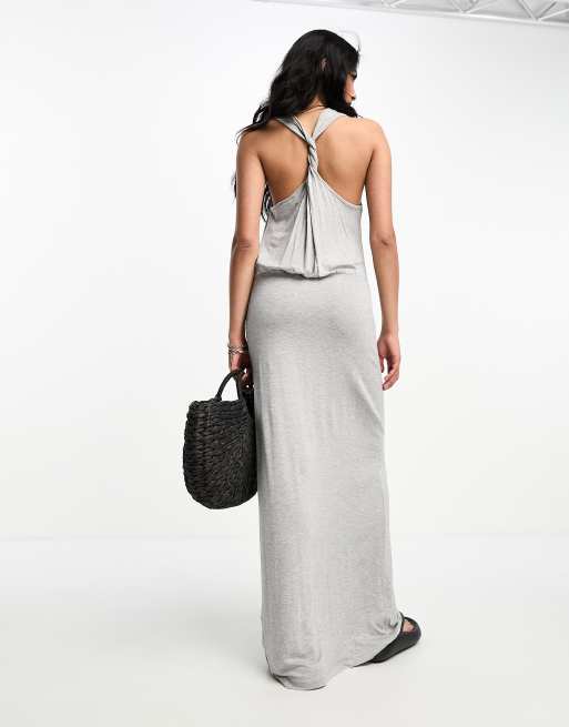 Vestido largo gris con falda fruncida, detalle retorcido en la espalda y cuello ancho de ASOS DESIGN