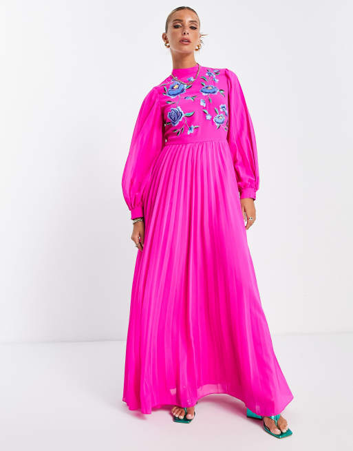 Vestido largo magenta plisado de manga larga y corte skater con cuello alto y diseño bordado de ASOS DESIGN