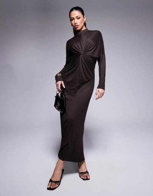 Vestido largo marrón chocolate de manga larga con cuello alto y detalle retorcido en la parte delantera de ASOS DESIGN