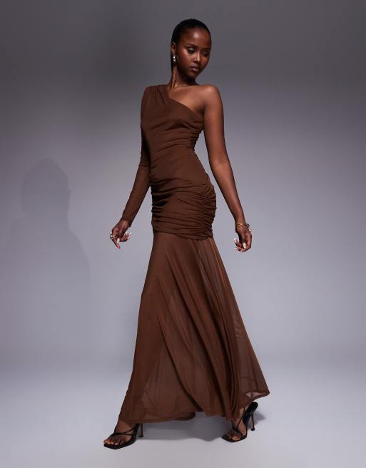 Vestido largo marrón de manga larga asimétrica con falda de corte amplio y detalle calado de malla de ASOS DESIGN