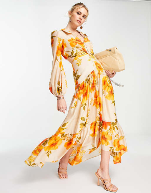 Vestido largo naranja escalonado con estampado floral, detalle de botones y solapas de voile de ASOS DESIGN