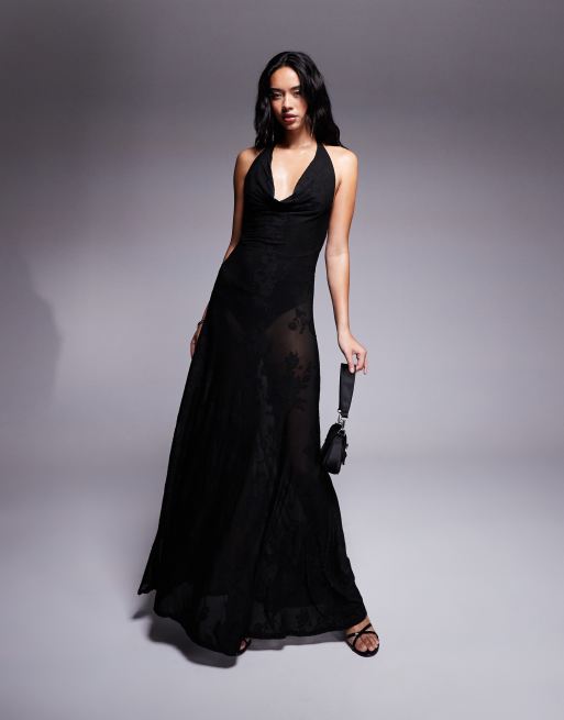 Vestido largo negro con body y cuello halter desbocado de devoré de ASOS DESIGN