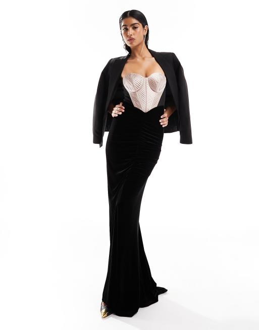 Vestido largo negro con corsé rosa en contraste de mezcla de terciopelo premium de ASOS DESIGN