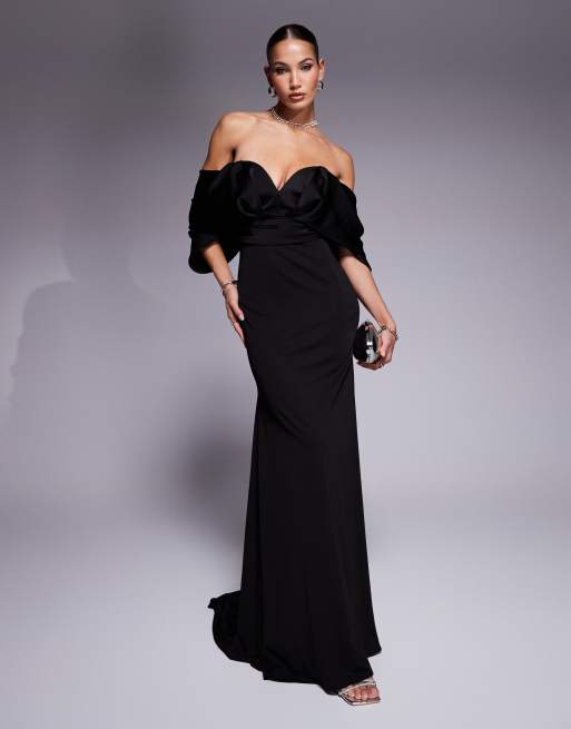 Vestido largo negro con detalle de cola, escote palabra de honor en forma de corazón de mezcla de satén premium de ASOS DESIGN