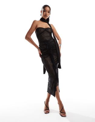Vestido largo negro con detalle de volante y diseño fruncido de jacquard de malla elástica de ASOS DESIGN