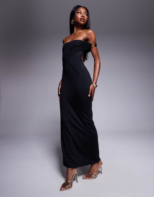 Vestido largo negro con escote palabra de honor, detalle de abertura y herraje dorado de ASOS DESIGN