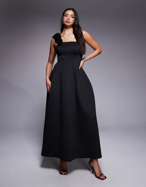 Vestido largo negro con escote palabra de honor y detalle de flor de tejido efecto neopreno de ASOS DESIGN
