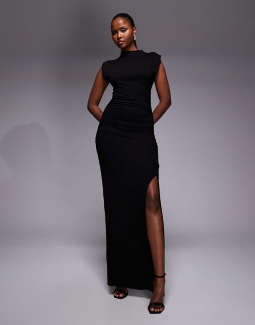 Vestido largo negro con lateral fruncido y abertura hasta el muslo de ASOS DESIGN