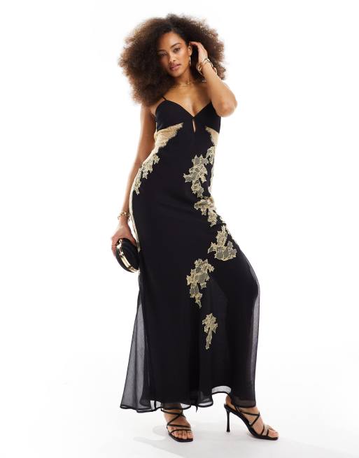 Vestido largo negro de corte al bies de chifón con aplicación de encaje de ASOS DESIGN