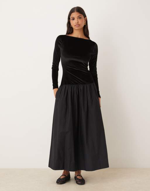 Vestido largo negro medianoche con diseño híbrido de terciopelo con falda de popelina de ASOS DESIGN
