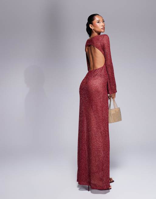 Vestido largo rojo con mangas ángel y abertura en la espalda de punto transparente brillante de ASOS DESIGN