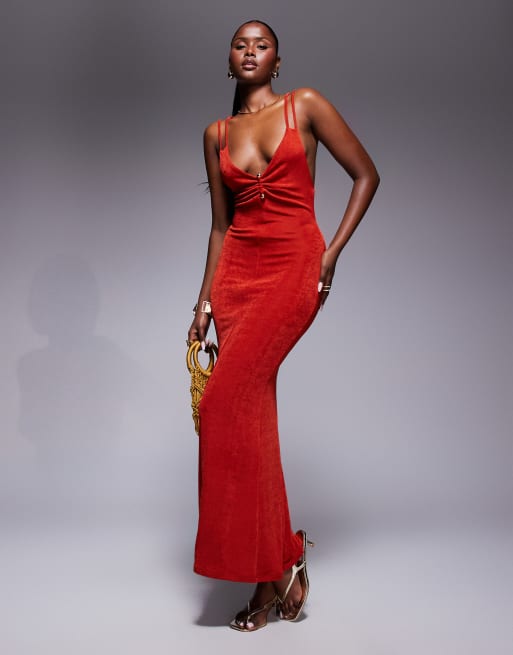 Vestido largo rojo fruncido en la parte delantera con espalda de tiras cruzadas y detalle dorado de ASOS DESIGN