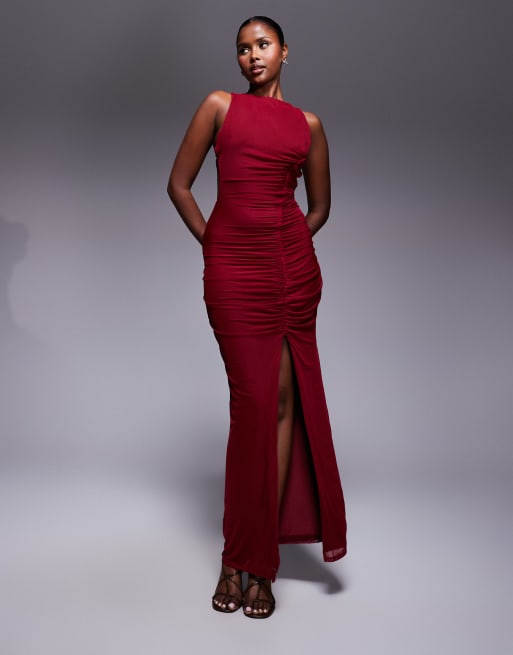 Vestido largo rojo guinda oscuro fruncido con diseño de tiras en la espalda de malla de ASOS DESIGN