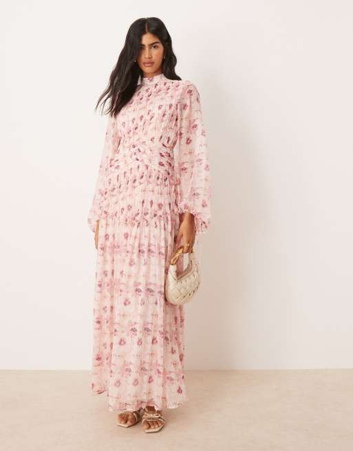 Vestido largo rosa fruncido con estampado floral difuminado, cuello alto y detalle de chevrón de ASOS DESIGN