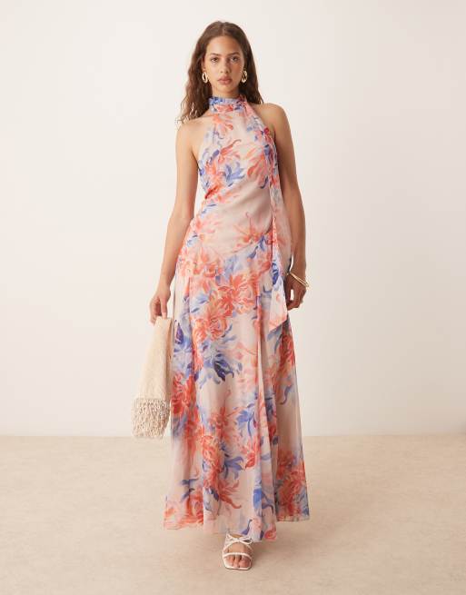 Vestido largo rosa y azul con estampado floral, cintura caída y cuello halter de chifón de ASOS DESIGN