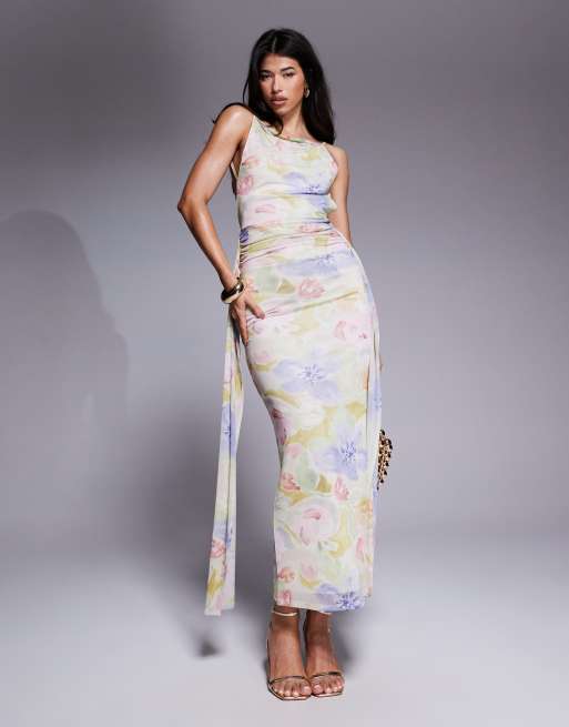 Vestido largo sin mangas con estampado floral, espalda abierta y detalle de fajín de ASOS DESIGN