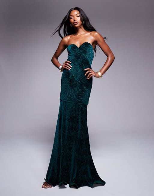 Vestido largo verde bosque con escote palabra de honor de terciopelo texturizado de ASOS DESIGN