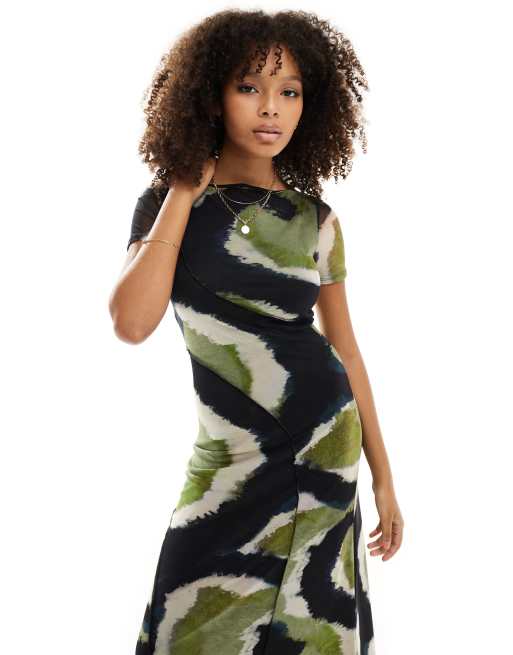 Vestido largo verde de manga corta con detalle de costuras y estampado abstracto de malla de ASOS DESIGN