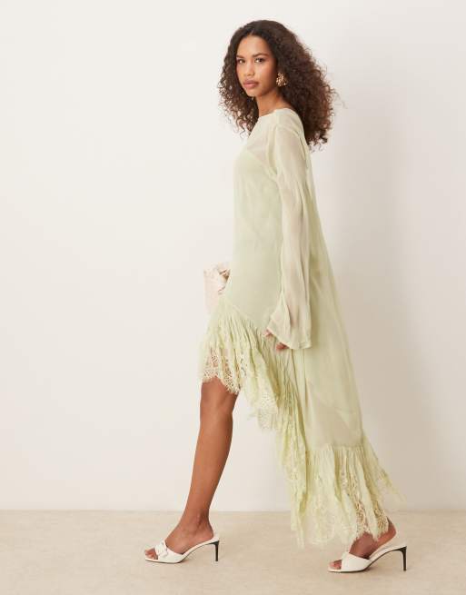 Vestido largo verde de manga larga con bajo asimétrico de encaje transparente de ASOS DESIGN