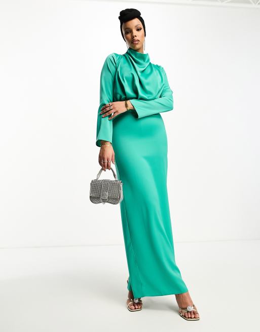 Vestido largo verde joya de manga larga con cuello alto y detalle plisado de satén Modest de ASOS DESIGN