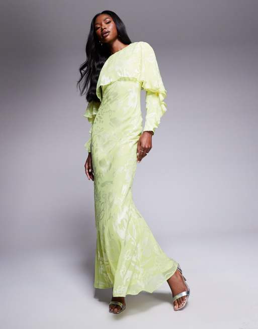 Vestido largo verde lima pálido de corte al bies y manga larga con diseño floral, volantes y detalle de capa de jacquard de ASOS DESIGN