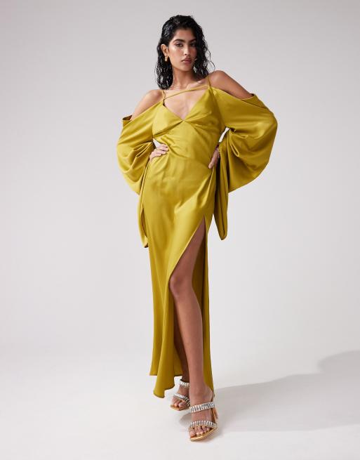 Vestido largo verde oliva con hombros descubiertos y mangas exageradas de satén de ASOS DESIGN
