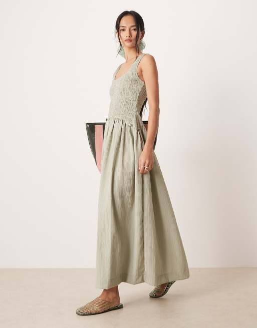 Vestido largo verde salvia con cuello ancho y cintura fruncida de tejido rugoso de ASOS DESIGN