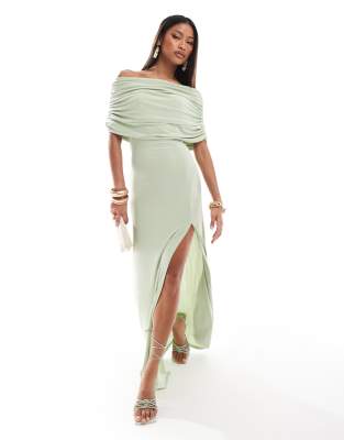 Vestido largo verde salvia con escote palabra de honor y abertura de ASOS DESIGN