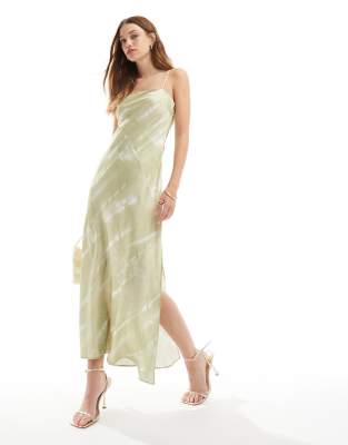 Vestido largo verde salvia de corte recto con escote palabra de honor y estampado abstracto de satén de ASOS DESIGN